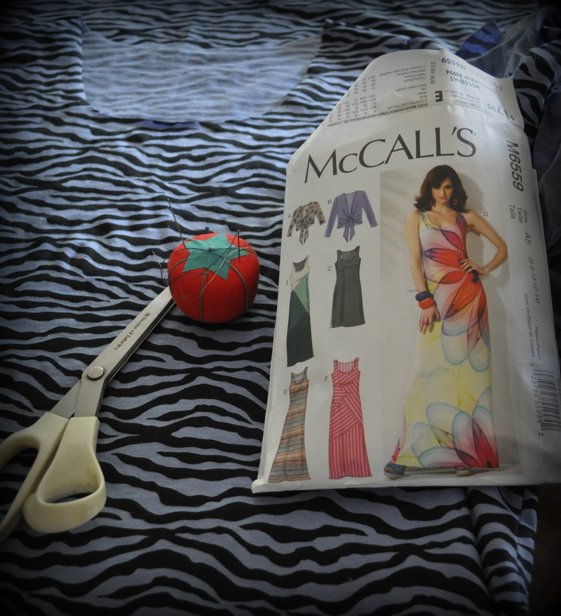 Then, some sewing. This dress is so easy to make and turns out so well it is almost sinful. Just four seams and some bias edging, out of knit fabric it is very comfortable in the hot weather; great to slip on while running errands.